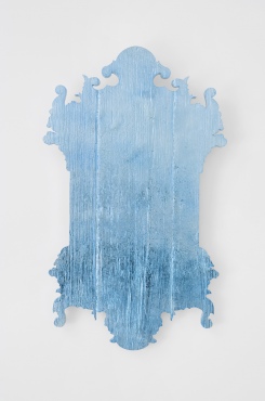 Situated inside the drapery room are two new pouffes, circular settees upholstered with varying colors, patterns and textures that refer back to the paintings of Marti’s early work. The pouffes also serve as abstracted portraits of his parents through their evocation of Whistler’s Arrangement in Grey and Black. Marti previously made reference to Whistler in his Grow Room installation for the 2004 Whitney Biennial, an arrangement of works derived from the configuration of Whistler’s Peacock Room. In the 2004 installation, Mylar sheets overprinted with images of flowers both invited and frustrated viewers’ attempts to examine their own reflections. In the present exhibition Marti includes a series of chromed mirrors to similar effect. Cast from uneven floorboards and composed in solid pastel colors with profiles derived from 18th-century Chippendale mirrors, these reflective but dysfunctional “looking glasses” might be more accurately described as monochromatic paintings that have affinities with Allan McCollum’s surrogate paintings and Jasper Johns’ paintings of flags, all being simultaneously pictures of an object and the object itself.